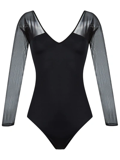 Black v-neck tulle panel Michelle swimsuit from Brigitte featuring a v-neck, long sleeves, tulle panels, a gold-tone logo plaque, satin-like fabric, an elasticated trimming, a lining and fresh touch. Swimwear must be tried on over your own garments.