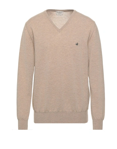 knitted, brand logo, lightweight knit, v-neck, solid color, long sleeves, no pockets, mélange , Color: Sand , Size: 48