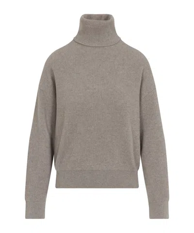 Brunello Cucinelli offers a refined turtleneck sweater, perfect for warmth and sophistication. This luxurious piece combines soft wool, virgin wool, cashmere, and silk, featuring a relaxed fit with an intricate ribbed texture. The high collar and long sleeves enhance its elegant silhouette, making it ideal for stylish layering in cooler weather. A versatile staple, it transitions effortlessly from casual gatherings to sophisticated outings.- Material: Soft wool, virgin wool, cashmere, silk - Fit: Relaxed - Texture: Intricate ribbed - Collar: High - Sleeves: Long - Versatile for casual and sophisticated occasions