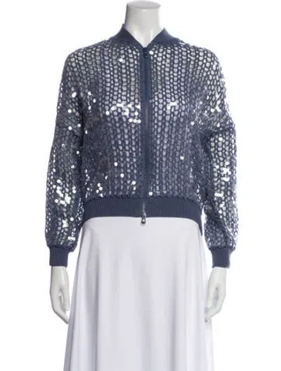 Brunello Cucinelli Bomber Jacket Blue Patterned Stand Collar Zip Closure Size not listed, estimated from measurements. Designer Fit: Jackets by Brunello Cucinelli typically fit true to size. | Brunello Cucinelli Patterned Bomber Jacket in Blue, Women's S