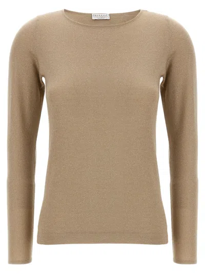 BRUNELLO CUCINELLI Shimmery Round Neck Knit Top In Light Brown