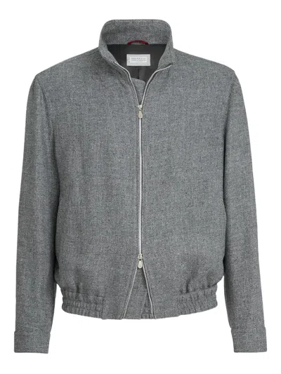 BRUNELLO CUCINELLI Stand Collar Hopsack Outerwear Jacket In Gray