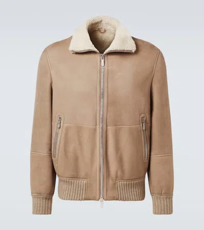 BRUNELLO CUCINELLI Suede Curly Shearling Bomber Jacket With Cashmere Knit Collar In Brown