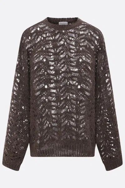 Brunello Cucinelli sweater crafted in brown linen and silk blend openwork-knit with allover sequins. It features a crew neckline, long sleeves and ribbed edges.