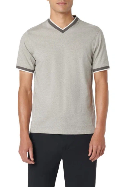 Mercerized cotton brings softness and polish to a T-shirt sporting a slightly higher V-neck and bands of two-tone tipping.