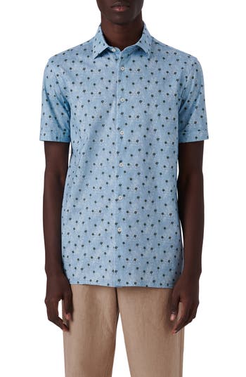 BUGATCHI Milo Ooohcotton® Palm Tree Print Short Sleeve Button-up Shirt In Blue