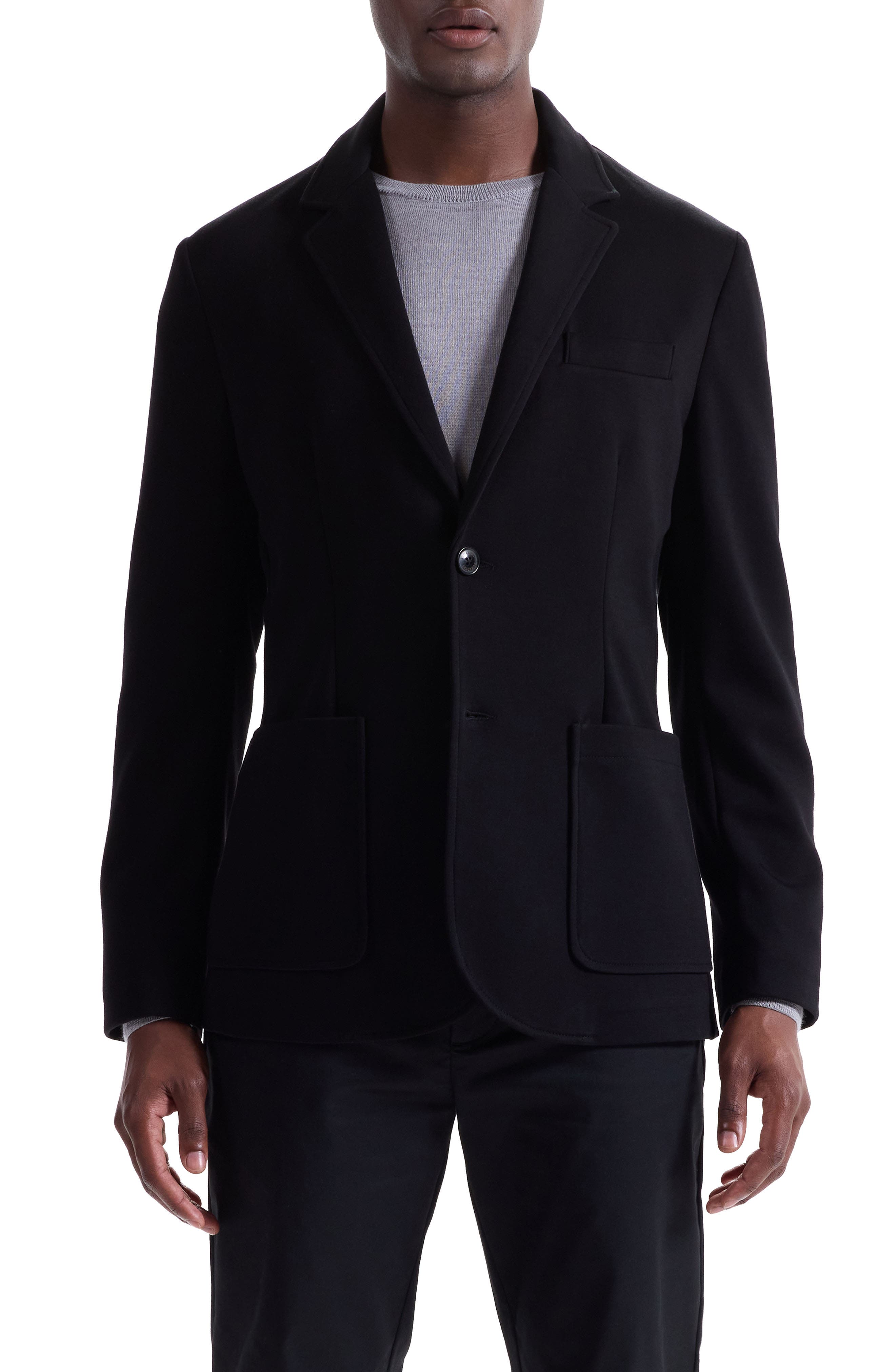 Designed to keep you looking smart on busy days and long travel, this blazer tailored from a stretch-enhanced knit features dark, solid coloring that works with any elevated-casual look. Softer construction in the shoulders and a subtly fitted waist provide a relaxed feel with a traditional silhouette.Fabrication: Knit fabric can be made of natural or synthetic fibers and bring a stretchy fit and a softer feel to sport coats, trousers and sometimes suits. Knits have a range of textures, but for formalwear they tend to feature a smoother finish to ensure a crisp look.Formality: Casual and elevated-casual occasions where you want to smarten a favorite look without being formal. 28 1/2" length Notched lapels Chest welt pocket; front patch pockets; interior pocket Back vent 48% rayon, 46% polyester, 6% spandex Dry clean Imported