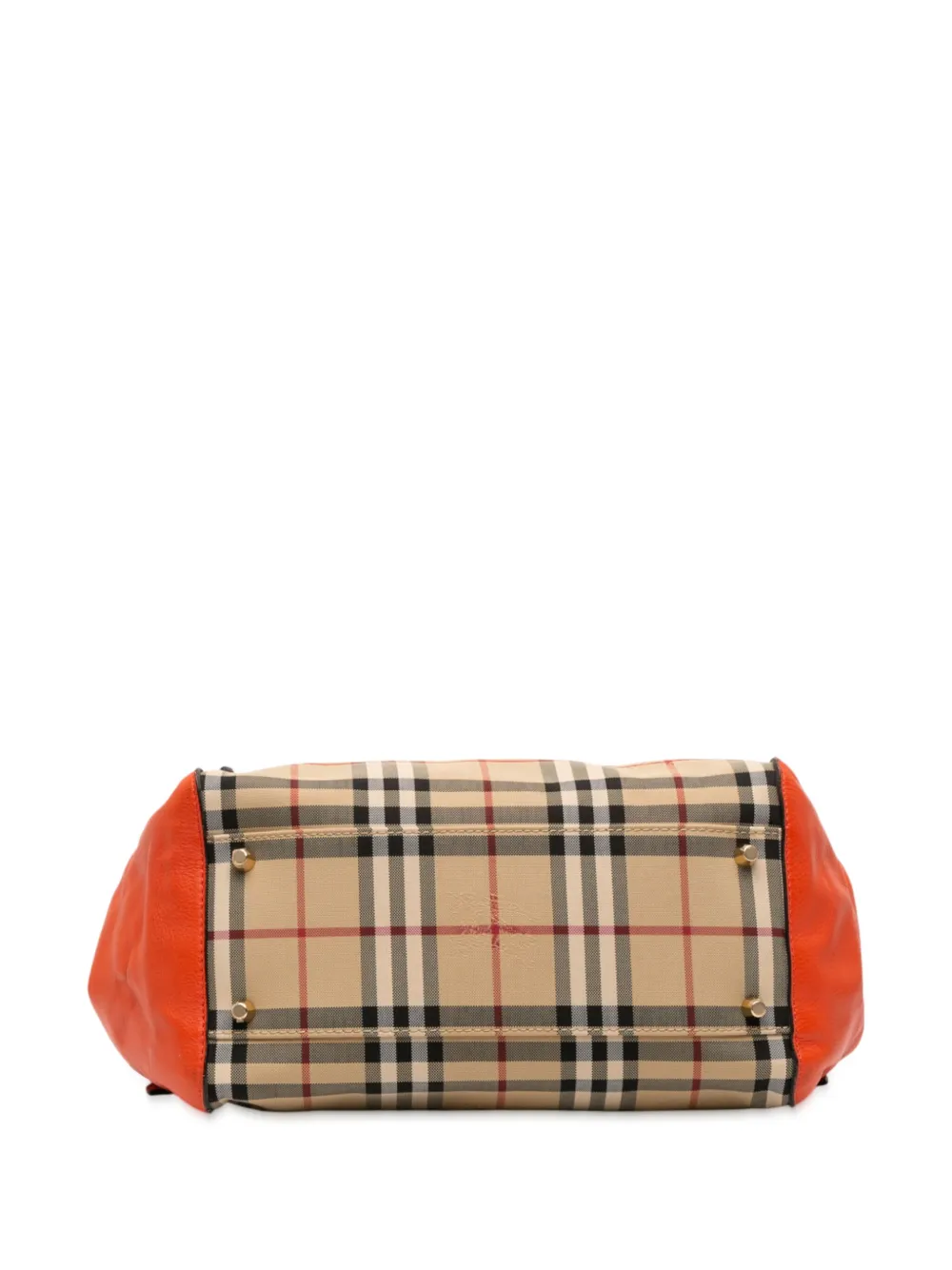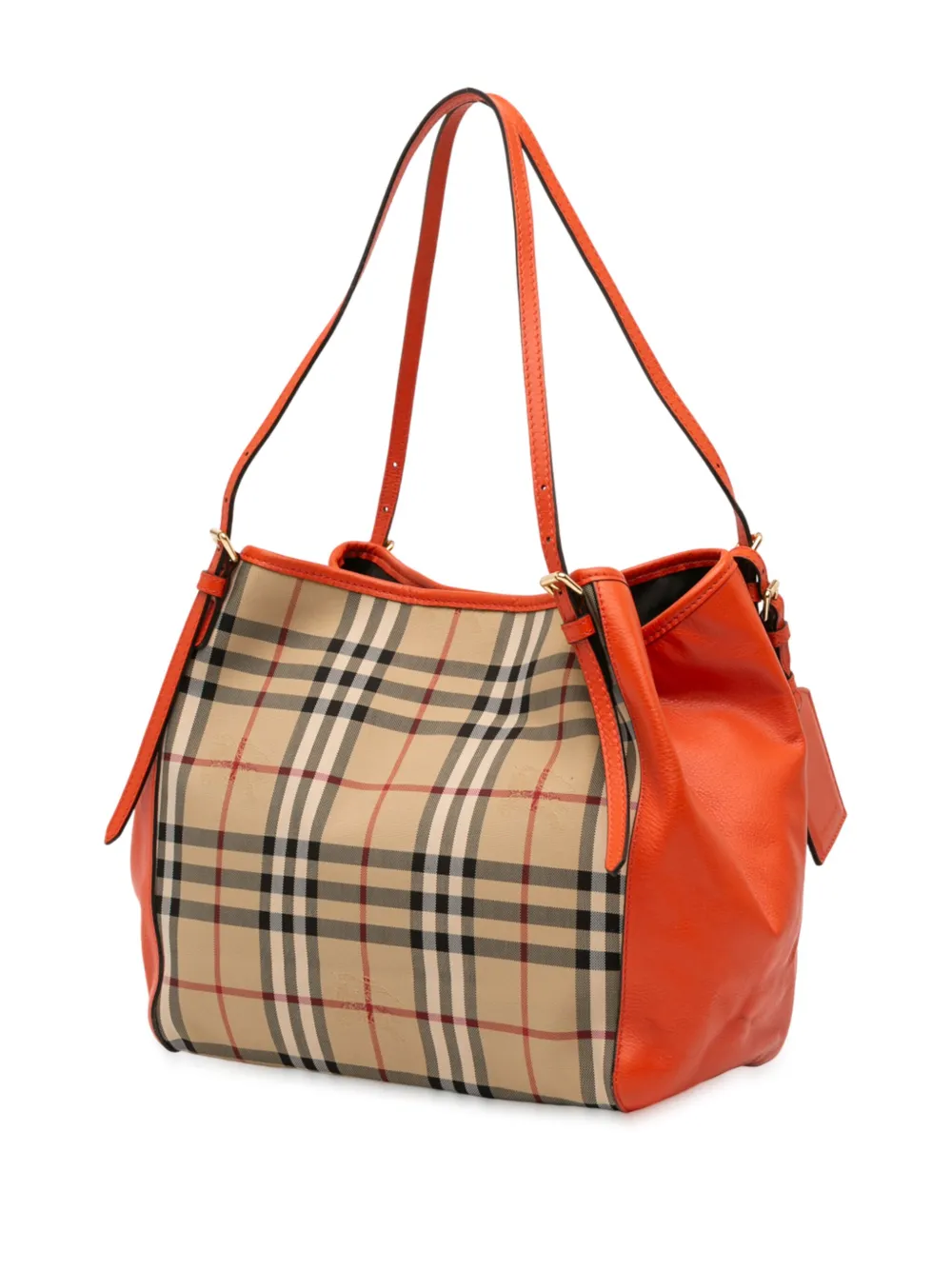 haymarket check canvas body with leather side panels adjustable flat leather handles open top with snap button closures interior zip and slip pockets brown Inclusions: name tag, dust bag. Condition: GOOD. This previously owned and used item is in good condition with minimal signs of use. This may include fading of material or plating and scratches. Please refer to the photos on this product page for a detailed view of the item, including any damages declared.