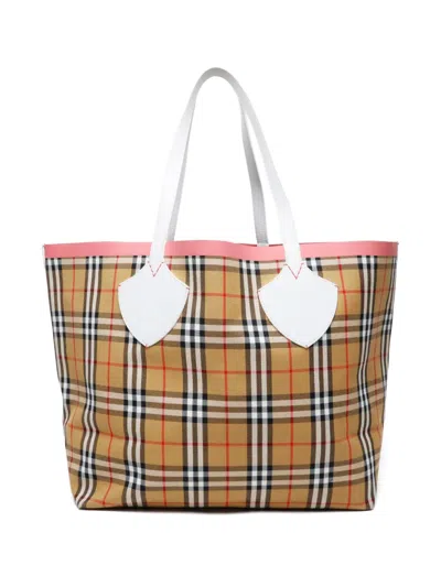 2020s beige signature Check pattern white top-handles pink leather-trim Condition: GOOD. This previously owned and used item is in good condition with minimal signs of use. This may include fading of material or plating and scratches.
