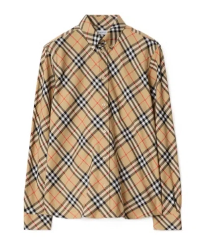 A long-sleeved shirt in cotton flannel woven with the Burberry Check in signature sand beige The design is tailored for a relaxed fit Button closure Button-down collar Single-button cuffs Curved hem Length 75 5cm 29 7in size UK M Model s height 187cm 6ft 2in Model wears size UK M Relaxed fit a looser cut than our regular fit 100 cotton Buttons mother-of-pearl Specialist dry clean Imported Item 81154971