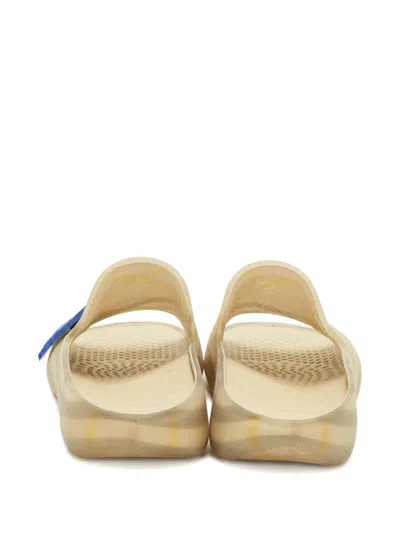 beige rubber check pattern detail appliqué open toe flat sole Condition: GOOD. This previously owned and used item is in good condition with minimal signs of use. This may include fading of material or plating and scratches.