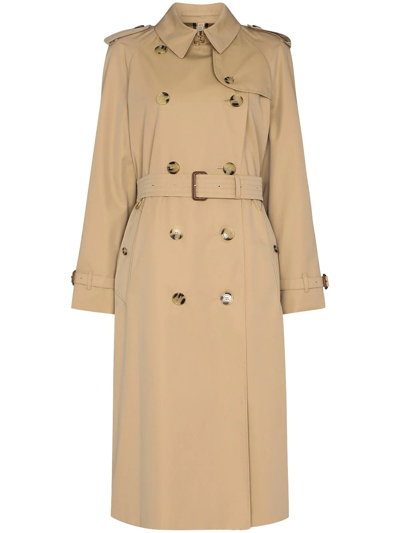 Beige cotton Waterloo double-breasted trench coat from BURBERRY featuring epaulettes, storm flap, spread collar, double-breasted button fastening, belted waist, long sleeves, two side slit pockets, belted cuffs, central rear vent and mid-length.