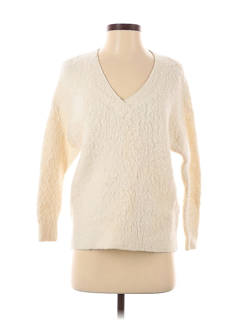 By Anthropologie Pullover Sweater, Size: X-Small. Item Details: Ivory, V Neck, 3/4 Sleeve, Shearling, Women's Tops, Nylon/Polyester/Merino Wool