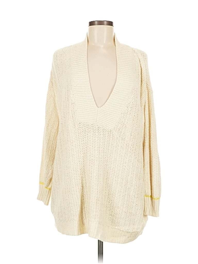 CAbi Pullover Sweater, Size: Medium. Item Details: Ivory, Plunge Neckline, Long Sleeve, Women's Tops, Cotton/Nylon/Lyocell