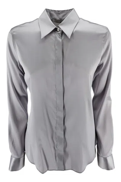 Camicia di Caliban in raso stretch. Maniche lunghe, abbottonatura nascosta. Vestibilita morbida. Composizione: 93% seta, 7% elastane.