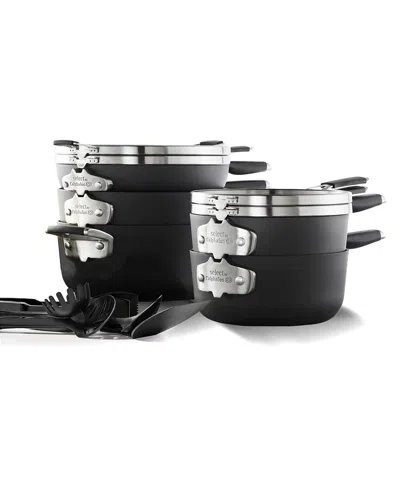 Select By Calphalon Space-Saving Hard-Anodized Nonstick Cookware Securely Stacks To Save 30% More Space. Plus, The Unique Cookware Design And Flat Glass Covers Stack And Nest In Any Order. This Cookware Set Features Popular Pots And Pans Needed For Everyday Cooking, And They Are Dishwasher-Safe For Easy Cleanup. The Cookware Features A Medium-Gauge, Hard-Anodized Construction For Long-Lasting Durability, And The Dual-Layered Nonstick Interior Is Ideal For Easy Food Release And Cleaning. This Nesting Cookware Set Is Oven-Safe Up To 400 Degrees F For Heating And Warming Versatility, And Features Stay-Cool Long Handles With A Silicone Comfort Grip That Provide Heat Resistance When Cooking On The Stovetop. The Select By Calphalon Space-Saving Hard-Anodized Nonstick Cookware 14-Piece Set Includes 8In And 10In Diameter Cookware Which Form Two Separate Stacks To Save More Space In The Kitchen. Measures 11In X 24.75In Nonstick Oven Safe & Dishwasher Safe Imported Contents Of Set: 10In Fry Pan 2.5Qt Sauce Pan With Cover 3Qt Sautz Pan With Cover 3.5Qt Sauce Pan With Cover 5Qt Dutch Oven With Cover 5-Piece Utensil Set (Solid Spoon, Slotted Spoon, Solid Turner, Pasta Fork, Tongs)