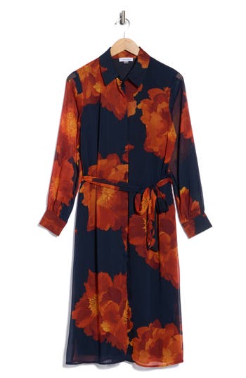 Make an entrance in this long-sleeve chiffon dress with bold blossoms over a flowing chiffon and finished with long, ethereal sleeves. 46" length (size 4) Button front closure Long sleeves with button cuffs Removable waist tie belt 100% polyester Dry clean Imported