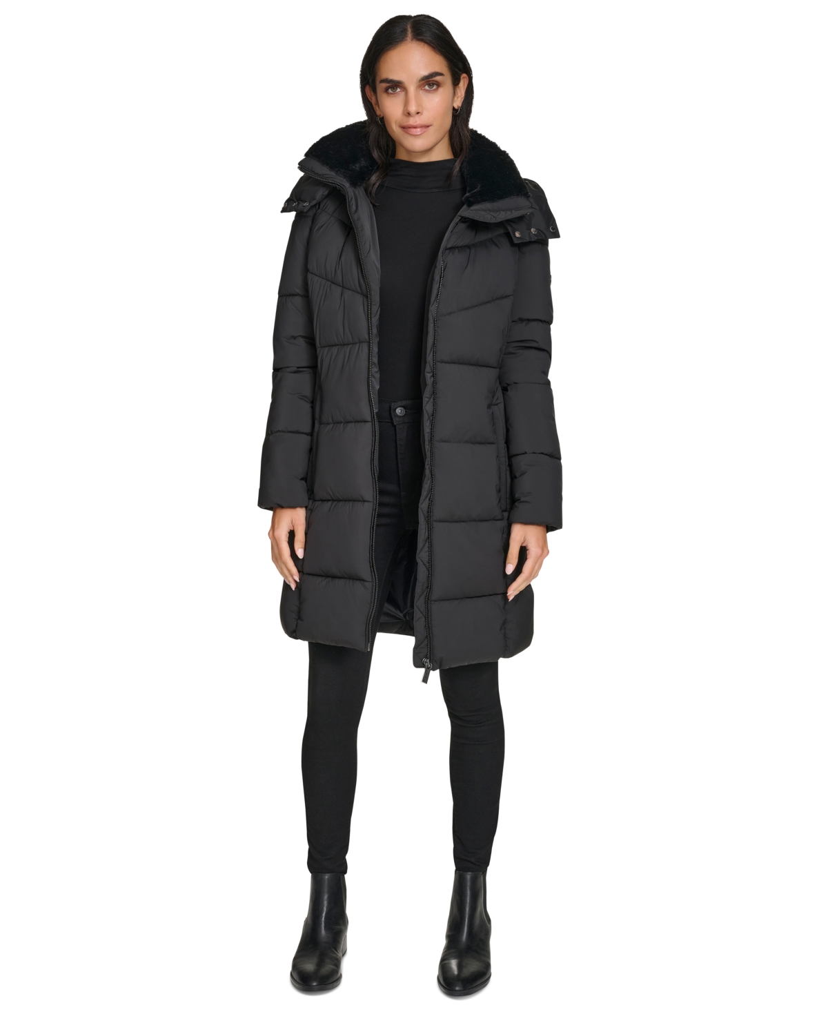 CALVIN KLEIN Women's Hooded Faux-fur-lined Midi Puffer Coat In Black