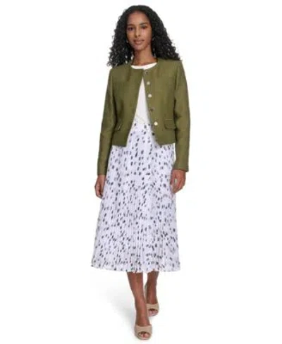 CALVIN KLEIN Womens Tweed Collarless Button Front Jacket Crewneck Ruched Sleeve Top Printed Pleated Pull On Midi In Green