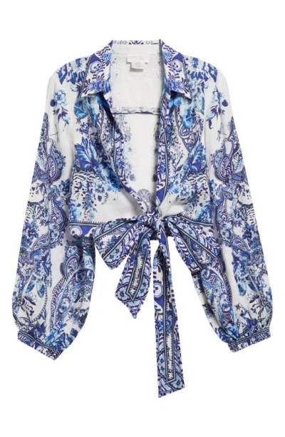 The Glaze And Graze Cropped Wrap Shirt With Border Yoke is a rhapsody of Delft blues and porcelain whites. Adorned with exquisite CAMILLA crystal embellishments, this luxury linen shirt is a true embodiment of opulence and style. The fitted wrap silhouette sits elegantly along the waistline with a statement border yoke detail. This lavish CAMILLA shirt is imbued with voluminous blouson sleeves to create a dramatically sculpted look. The lavishly generous tie fastening allows you to cinch and shape the shirt according to your desired fit. . Explore more from the Wonderkind collection.