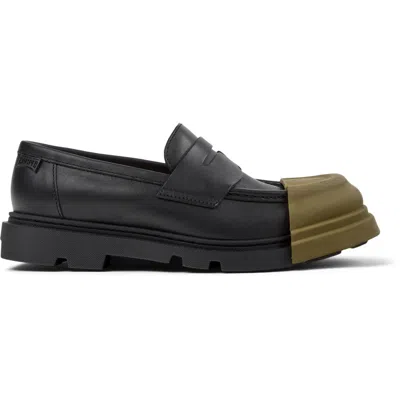 CAMPER - Black calfskin moccasins for women with removable OrthoLite® Recycled™ footbeds and rubber outsoles. Made with minimal components and glue, Junction is easy to dissassemble promoting a more circular approach to shoe-making.
