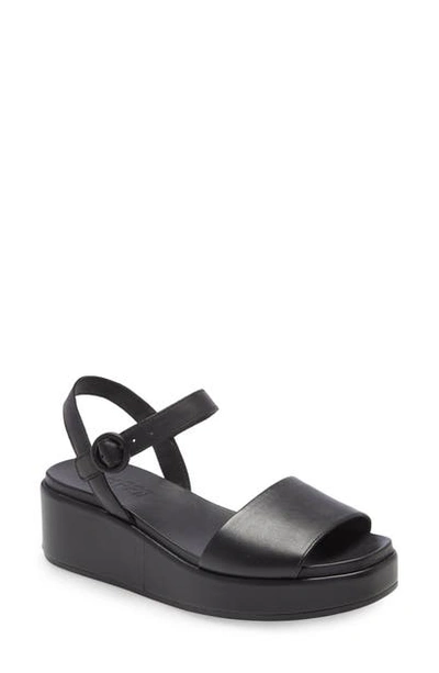 Black leather Misia platform sandals from Camper featuring an open toe, an ankle strap with a side buckle fastening and a platform sole.
