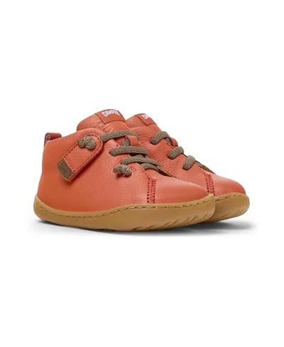 CAMPER - Orange calfskin leather kids' ankle boots with EVA removable footbeds, elastic laces, and hook and loop system and recycled rubber outsoles (20% recycled). The First Walkers range features flexible-yet-sturdy styles made for little ones who are taking their first steps. Discover our collection of comfortable shoes for toddlers that are designed to support those ready to embark out on their own. A Camper Icon that evolves with every season. Peu is functional simplicity inspired by walking barefoot. It is 360-degree stitched and built with a Strobel construction technique, guaranteeing unmatched flex and durability under any conditions.