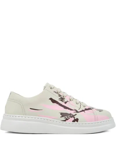 light beige leather pink brown print lace-up fastening flat sole round toe