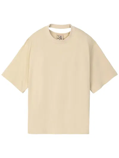 light beige crew neck drop shoulder wide sleeves cut-out detailing