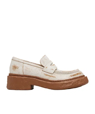 Dirty details, moccasin toe and upper with openwork straps, padded collar, OrthoLite Recycled insole, polished calfskin and suede lining, sculpted textured rubber block heel and midsole, textured rubber outsole.
