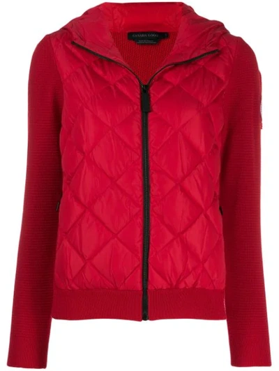 Red wool and feather down padded front jacket from Canada Goose featuring a hood, a front zip fastening, long sleeves, a logo to the left arm and a ribbed hem and cuffs.