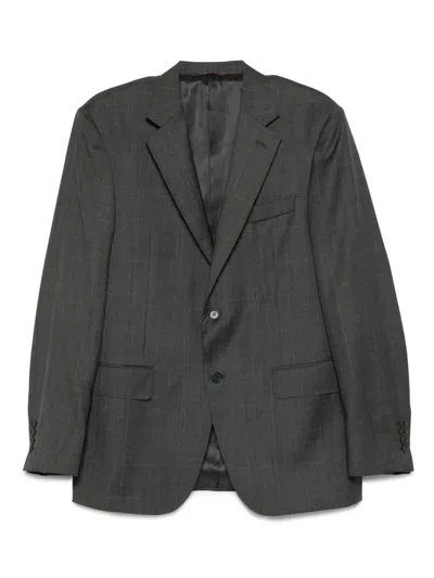 grey checked pattern flat front side flap pockets button fastening straight leg
