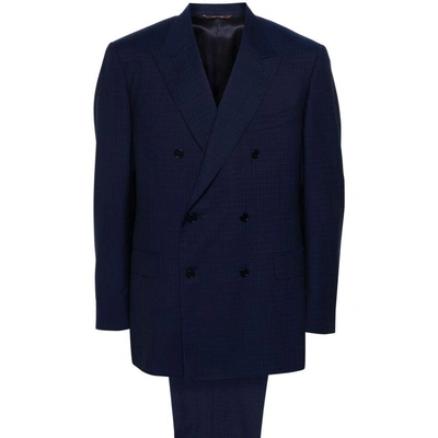 Navy blue wool check pattern blazer: peak lapels shoulder pads long sleeves faux buttoned cuffs chest welt pocket two front flap pockets english rear vents satin lining double-breasted button fastening trousers: belt loops pressed crease two diagonal pockets to the sides two rear button-fastening jetted pockets concealed fly and button fastening