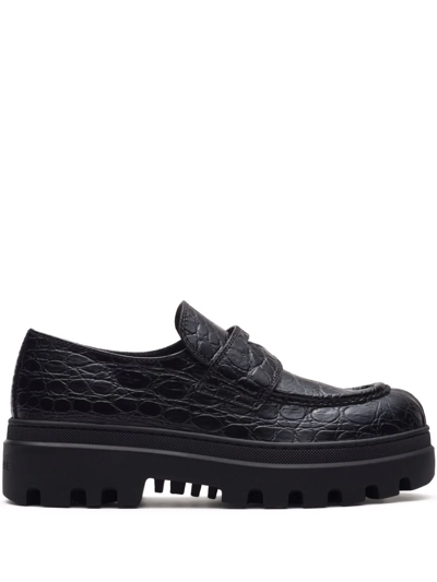Black leather crocodile effect moccasins from CAR SHOE featuring crocodile effect, almond toe, branded leather insole, slip-on style and chunky rubber lug sole.
