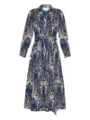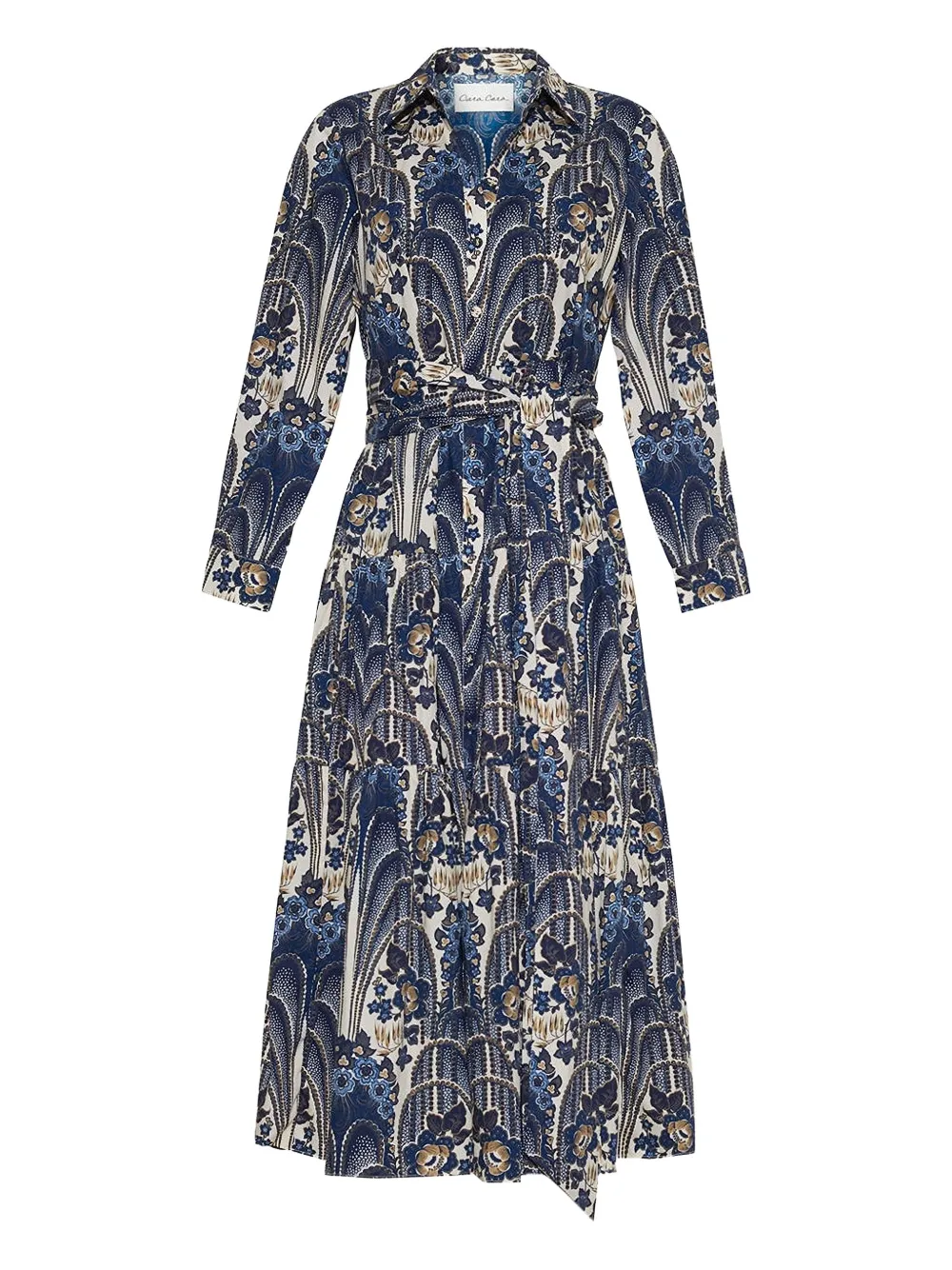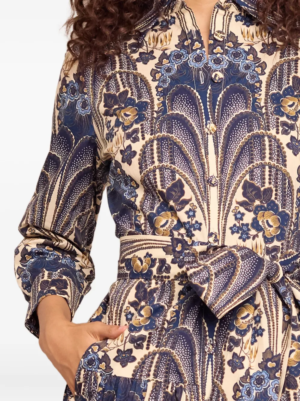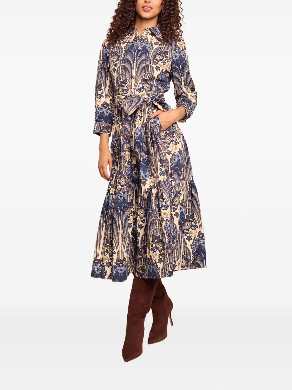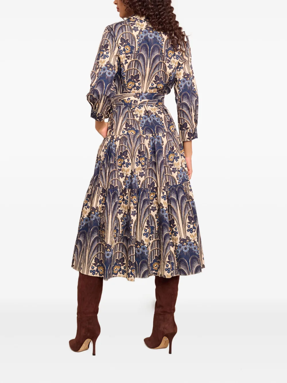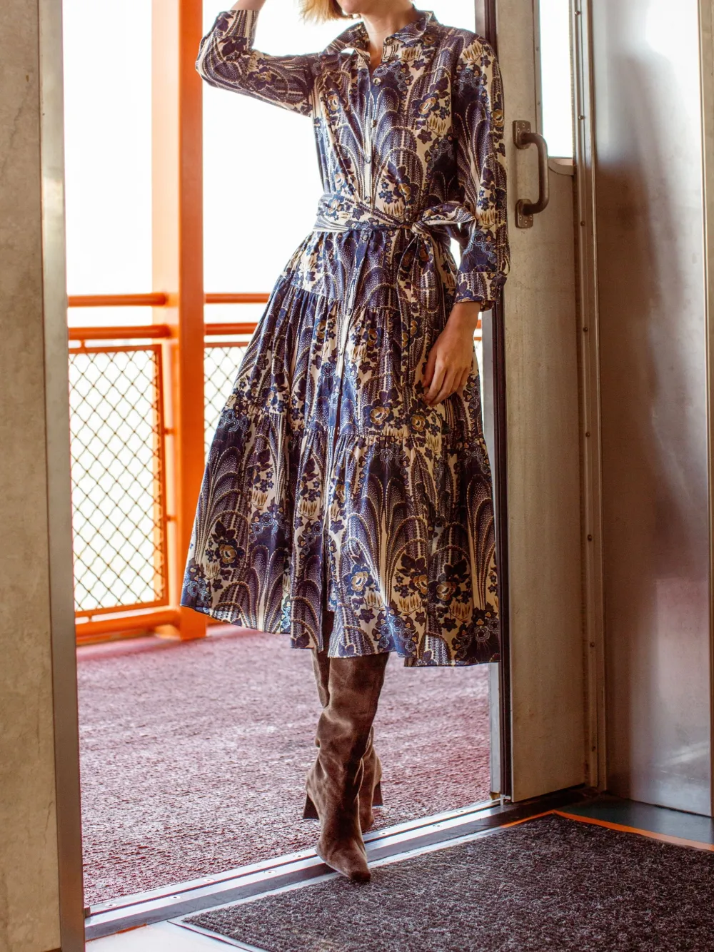 navy blue paisley print tiered skirt collared neckline long sleeves self-tie waist belt