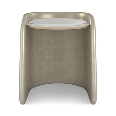 Reminiscent of asymmetrical jewelry cuffs by Elsa Peretti, Bauble's gently flowing base wraps around a soft-frosted glass top, backed in white and peppered with delicate gold flecks. This piece is spectacular because the base's finish has an undulating finish to reflect light; and the table is enrobed in a hand applied Oracle Broken Leaf that glimmers inside and out.
