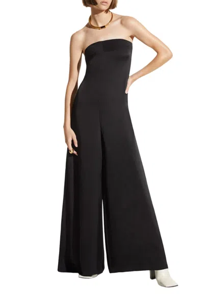 Strapless, Chic, and statement-making, the Erika Jumpsuit exudes laid-back sexy with a voluminous wide leg and side pockets. Exaggerated leg opening. Internal silicone adhesive support. 100% Silk Satin. Elegant easy fit.