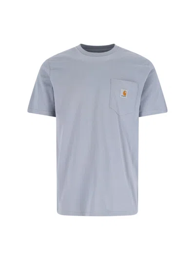 Carhartt WIP logo T-shirt in light blue cotton with crew neck, short sleeves, chest pocket, logo label detail, straight hem. Composition: 100% Cotton
