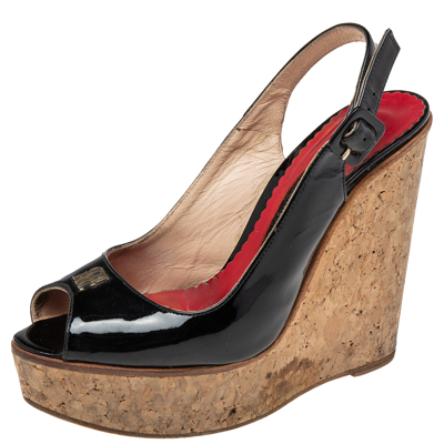 Pre-owned Black Patent Leather Peep-toe Cork Wedge Platform Slingback Sandals Size 37