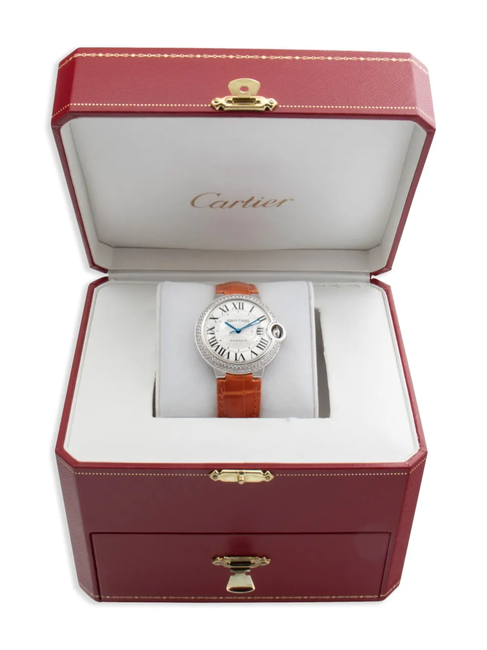 pre-owned Ballon Bleu 36mm from Cartier Pre-Owned featuring white, 18kt white gold, round face, Roman numeral dial, baton hands, diamond-encrusted bezel, screw-down crown, leather strap, folding clasp, automatic movement and 36mm. This item comes with a standard one-year warranty from the boutique.. Purchasing this item continues its narrative and reduces the environmental impact by avoiding the use of new resources needed to make the product from scratch, such as water, materials and electricity, and avoiding additional manufacturing impact.. Learn more about what makes a product Conscious on our Conscious Criteria page.