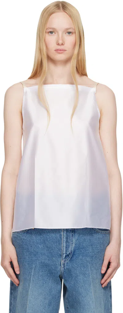This exquisite white silk-blend top embodies understated elegance. Designed with a straight silhouette, it features a wide neckline and adjustable beige straps, enhancing its refined aesthetic. The luxurious fabric showcases pressed creases that add depth and texture, while the straight hem offers a minimalist look that transitions effortlessly from day to night. 71% polyester, 29% silk Wide neckline Adjustable beige straps Straight silhouette Pressed creases for texture Straight hem