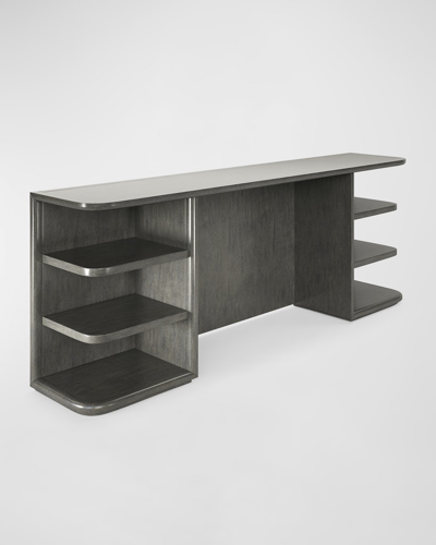 Cannello is a minimalist console table highlighted by floating shelves and the richness of starburst primavera veneers. It features four suspended shelves and a fully finished recess design. Handcrafted of poplar wood, veneer, and wood composite Overall, approx. 78"W x 16"D x 29.5"T Includes hardware Finished back Weight, 127.8 lbs Imported Boxed weight, approximately 189.6 lbs