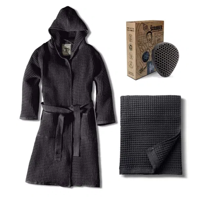 Wrap yourself in the cult-favorite robe, crafted from 100% naturally dyed cotton that redefines comfort. Dry off fast with a towel engineered to absorb shower drippings like a sponge. And get seriously clean with a scrubber that exfoliates. What's inside: 1x Bathrobe 1x Bath Towel 1x Charcoal-infused Scrubber (Towels & Bathrobes) Care Instructions: Stretching the life of your new bathrobe & towels depends entirely on how you wash and care for it. Wash separately to prevent zippers or buttons from snagging on the fabric. Avoid fabric softeners, bleach, or dryer sheets as they coat the fibers and reduce absorbency. Always wash in cold water. Lay flat or hang outside to dry. If using a dryer, choose low heat only. (Scrubbers) Care Instructions: Rinse it thoroughly and squeeze out all excess water. Hang it to dry fully after every use. Avoid leaving it flat or in a puddled surface, as airflow is what keeps the fibers fresh for longer. The lifespan of your scrubber depends on how well it is cared for, so hanging is essential. When it eventually reaches the end of its journey, you can cut it into small pieces and return it to the soil, where it naturally breaks down as it is fully biodegradable.
