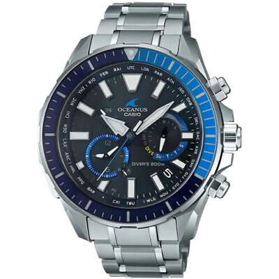 Item Description Thank you for your viewing! CASIO OCEANUS CACHALOT OCW-P2000-1AJF Diver`s 200m - Bluetooth Mobile Link l Case and band material: Titanium l Tough Solar MVT l Titanium Carbide Processing l Sapphire glass l Neo Bright l Bluetooth Mobile Link Function l ISO200m l Wave reception function - Multiband 6 l Airplane mode l Display time: 38 time zones (27 cities + UTC) l Stopwatch 1/1 second l Hand Position Automatic Correction function l Battery Charge warning function l Power saving function l Date and day display l Full Auto calendar Brand Casio Model number OCW-P2000-1AJF Manual N. 5624 Case material Titanium Band Material Titanium Glass Type Sapphire Item Shape Round Display Type Analog Case diameter 51.8 x 48.5 mm Case Thickness 15.9 mm Band width 20 mm Item weight 127.0 g Band Color Silver Dial color Black Drive System Tough Solar Water resistant 20 ATM Please Note: Import duties, taxes, and charges are not included in the item price or shipping cost even if the ship