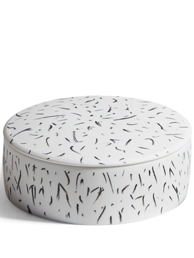 Post Scriptum porcelain container from Cassina featuring black/white, porcelain, abstract pattern print, hand-painted design, cylinder body, matching lid and 70x125mm.