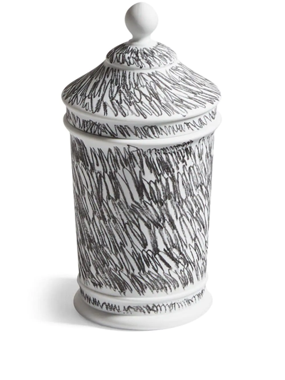 Conceived by research-based design studio Formafantasma for Cassina, the 'Post Scriptum' collection brings together a series of hand-painted porcelain objects. Inspired by silhouettes found in the extensive Ginori Manufactory archives, the designers have applied a contemporary facelift to a family of familiar shapes in the form of graphic 'graffito' decorations. This is achieved through hand drawing each graffito pattern onto bisque porcelain with ceramic chalk crayons and firing the surface to set the pattern. On this slim and spherical container, the grafitto takes shape as a series of tightly packed black paint stroke-like flecks for a sporadic but consistent decoration that covers the exterior and lid.