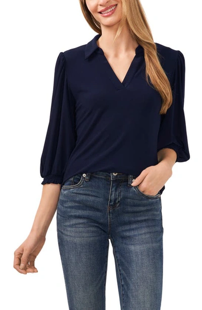 Introducing the CeCe Split Neck 3/4 Sleeve Knit Top in Navy J, a must-have addition to your wardrobe this season. Crafted from a luxurious crepe knit fabric, this top features a stylish collared neckline and elastic sleeve openings for a comfortable fit. The rich navy color adds a touch of sophistication to any outfit. Made from a blend of 95% polyester and 5% spandex, this top is both comfortable and easy to care for with a simple machine wash. Imported for your convenience, this top measures approximately 23 inches from shoulder to hem. Elevate your everyday look with the CeCe Split Neck 3/4 Sleeve Knit Top.