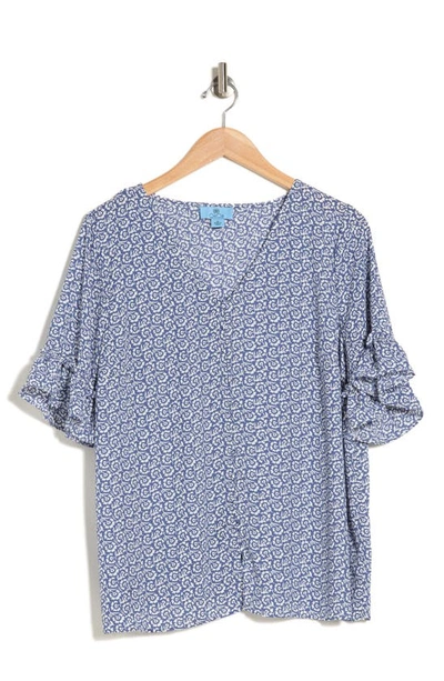 CECE Double Flutter Sleeve Button Front Blouse In Denim Blue/ White