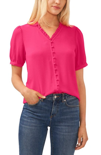 CECE Puff Sleeve Button Front Top In Bright Rose