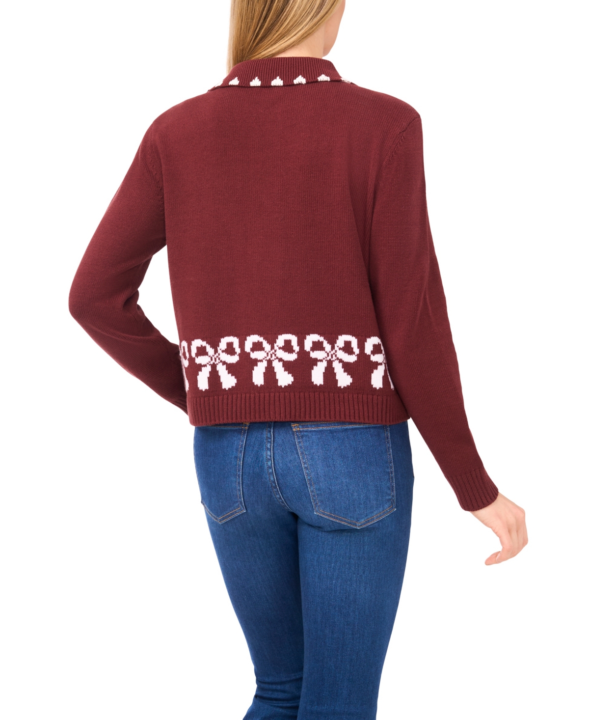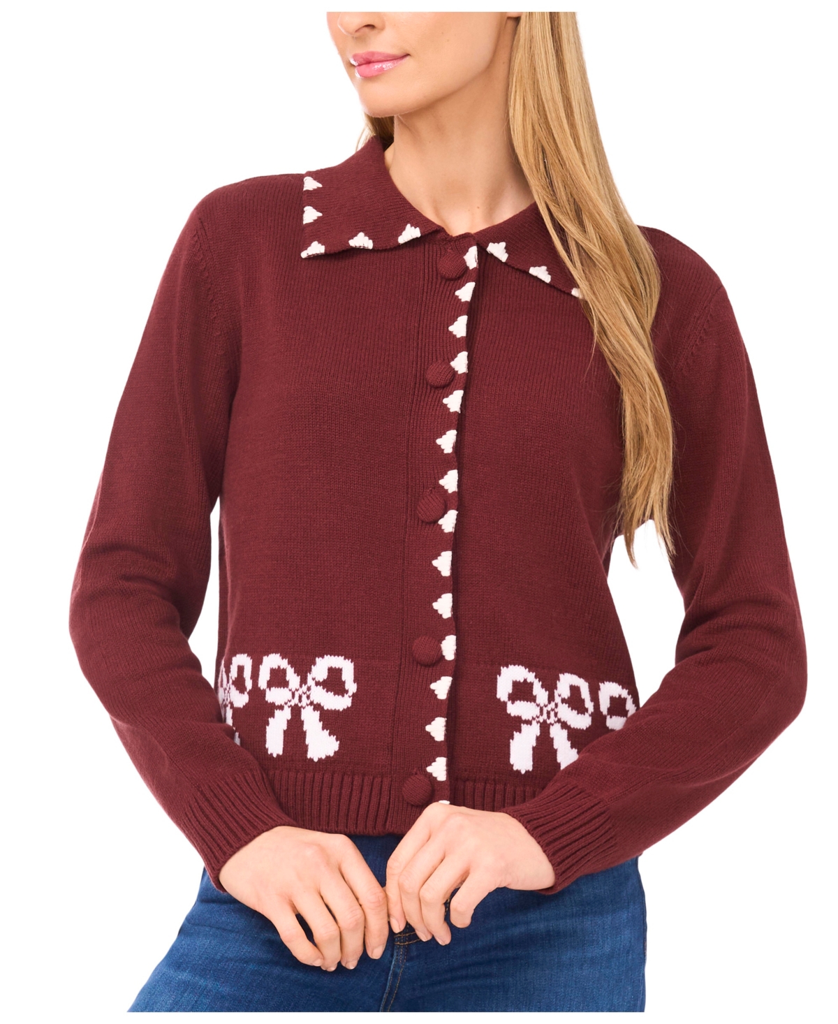 CECE Women's Ribbon Jacquard Collared Cardigan Sweater In Burgundy